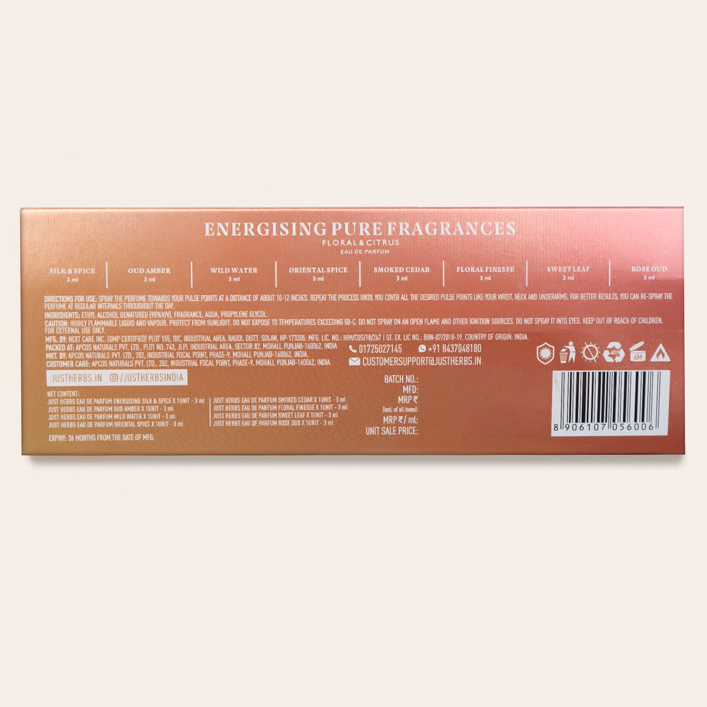 Indulge your senses in the enchanting world of Just Herbs' set of 8 Floral & Citrus EDPs. Immerse yourself in this harmonious fusion, where nature's finest blooms and vibrant citrus notes unite to create a truly delightful fragrance experience.