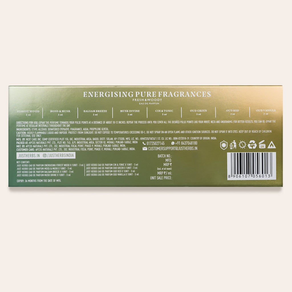 Indulge your senses in the captivating world of Just Herbs' set of 8 Fresh & Woody EDPs. Experience the harmonious fusion of refreshing greens and comforting woods, where vibrant bursts of nature intertwine with warm and earthy essences.