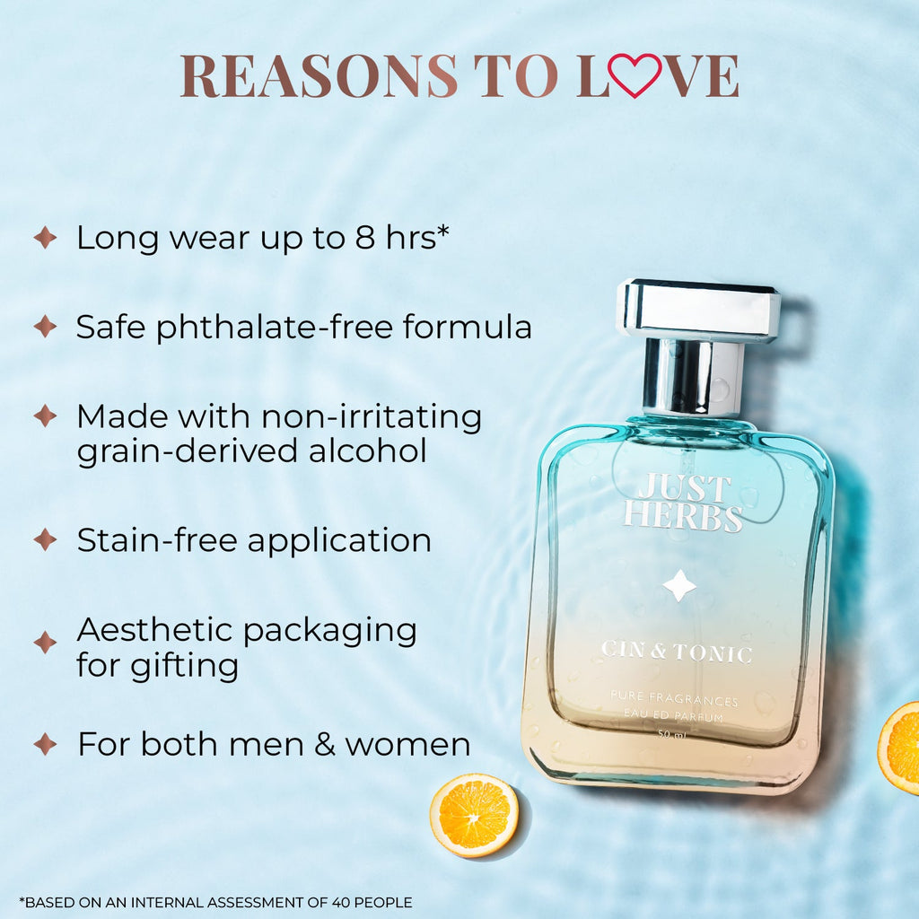 Introducing Just Herbs Cin & Tonic, an energetic fragrance for your go-getter self. Each spritz will give you hints of spicy Patchouli and Musk with the sweetness of Bulgarian Rose, leaving a trail of citrusy Orange & Lemon for an energising breath of freshness.