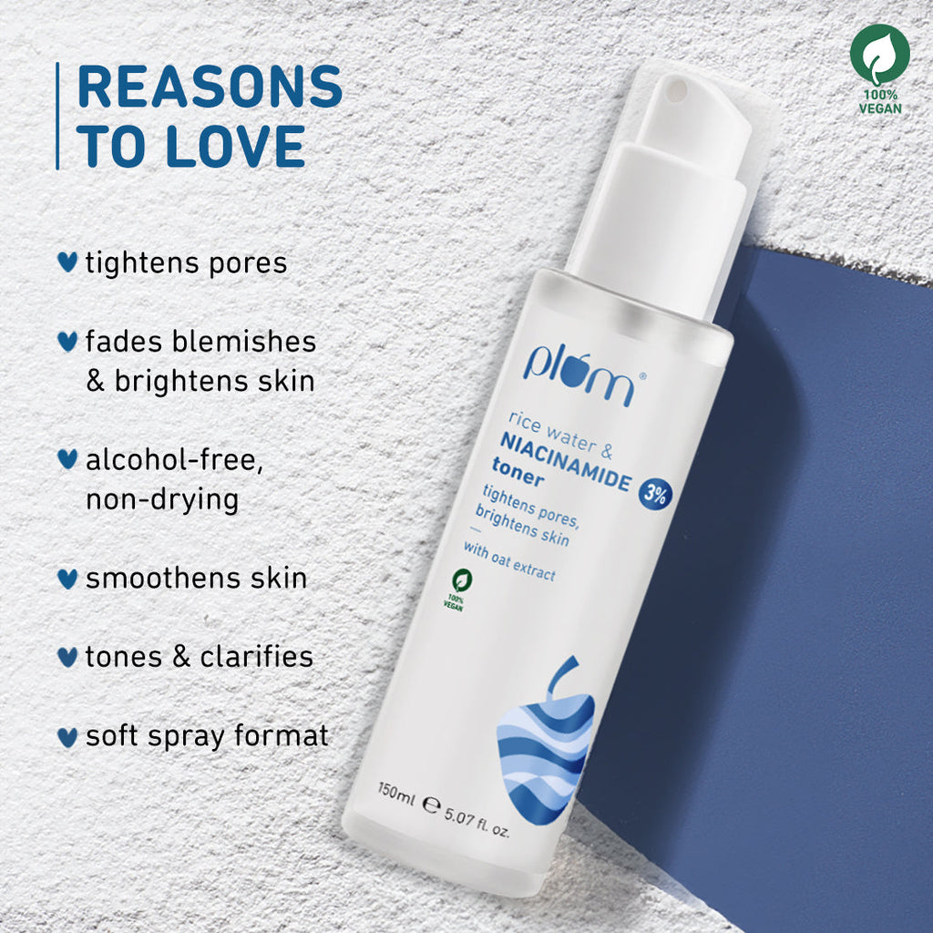 • 3% Niacinamide Toner: Feel the love of Niacinamide, Rice Ferment & Oat Extracts on your skin. This multi-tasker's ingredient list is filled with goodies that hydrate & strengthen the skin barrier, help reduce appearance of pores & keep acne in check.