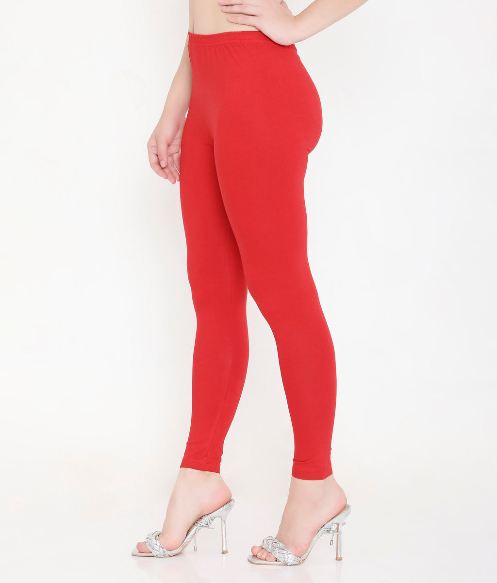 SOLID RED ANKLE-LENGTH COTTON LEGGINGS FOR WOMEN